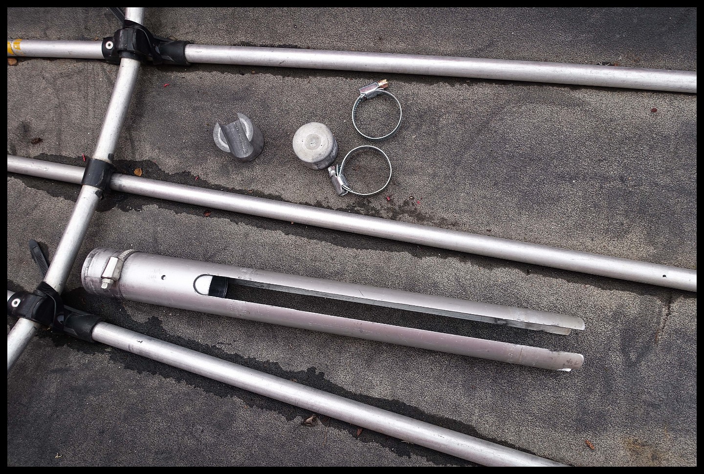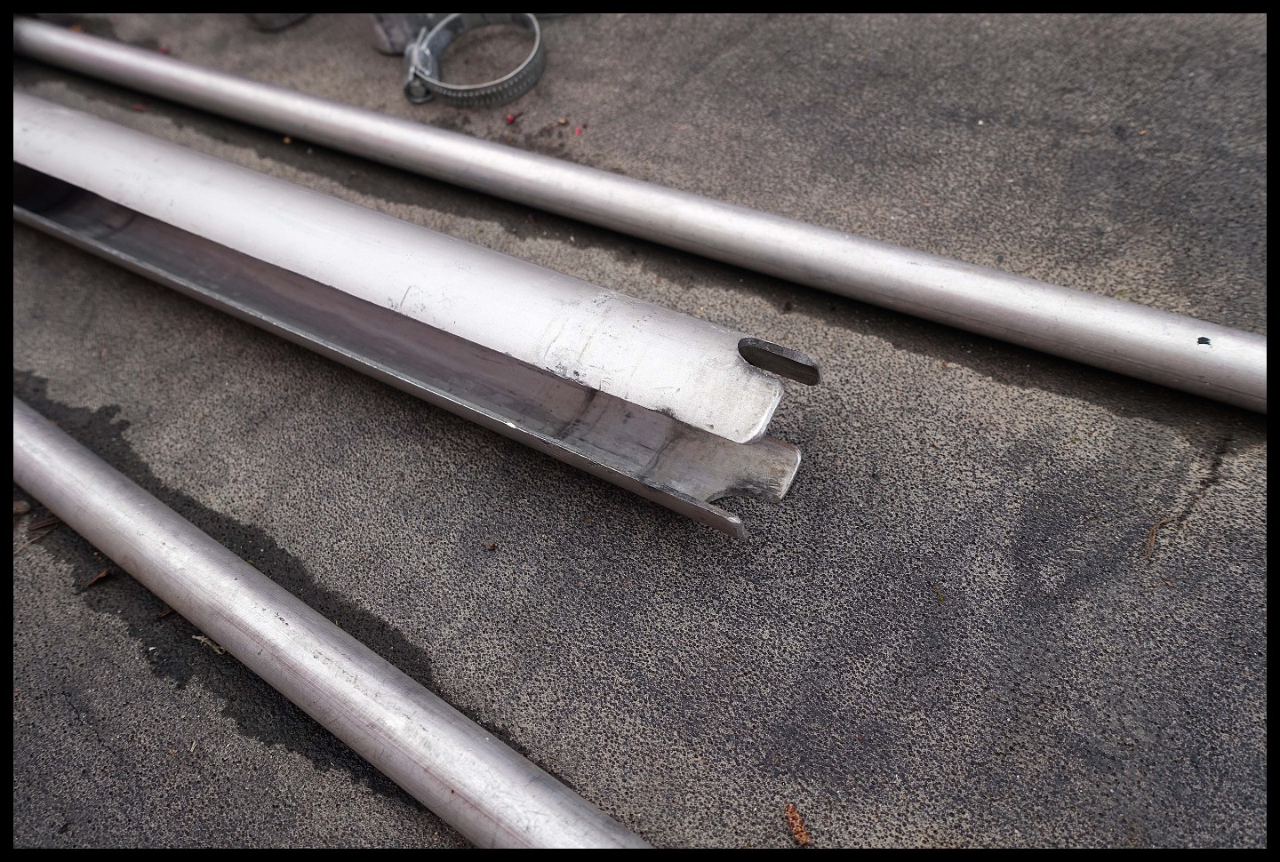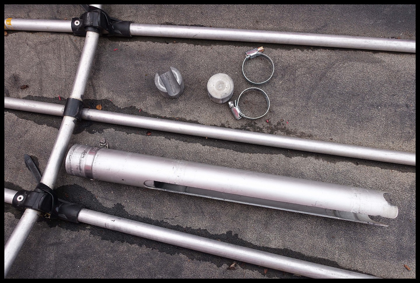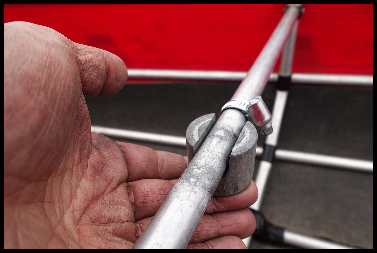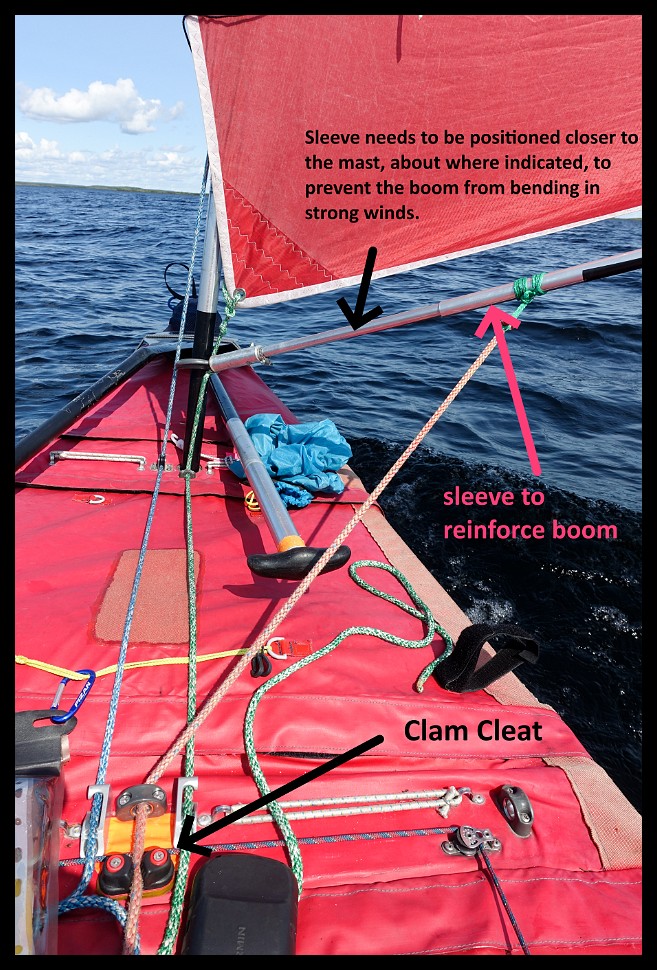 The Ally gunnels (AD 16 mm + ID 13.7 mm) used as the boom is not rigid enough in strong winds. A 70 cm sleeve (AD 19.5 mm + ID 16.6 mm) will reinforce things sufficiently - if positioned properly, like closer to the mast.