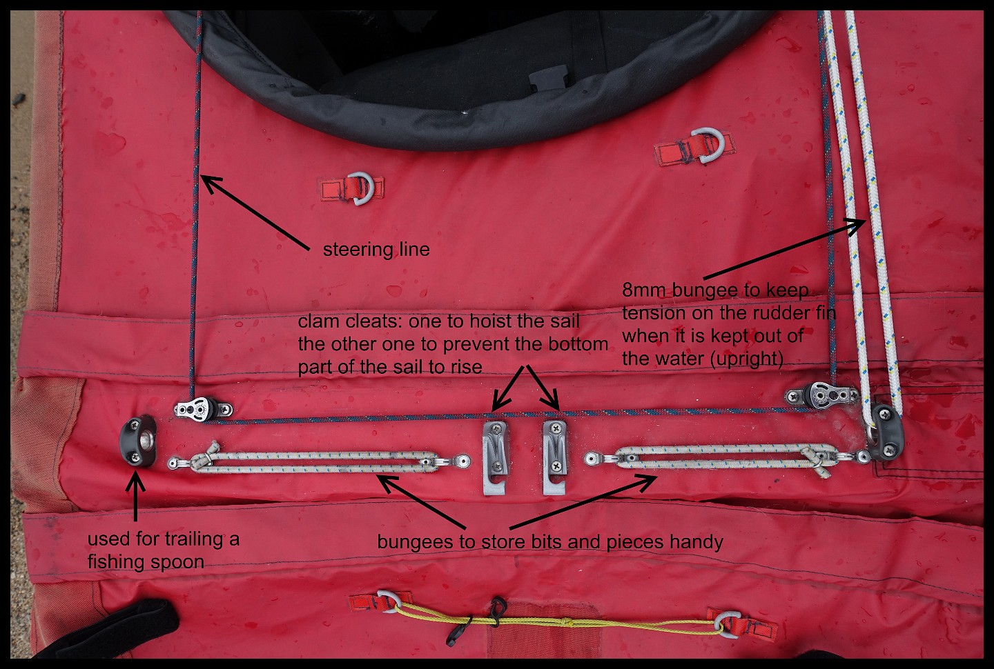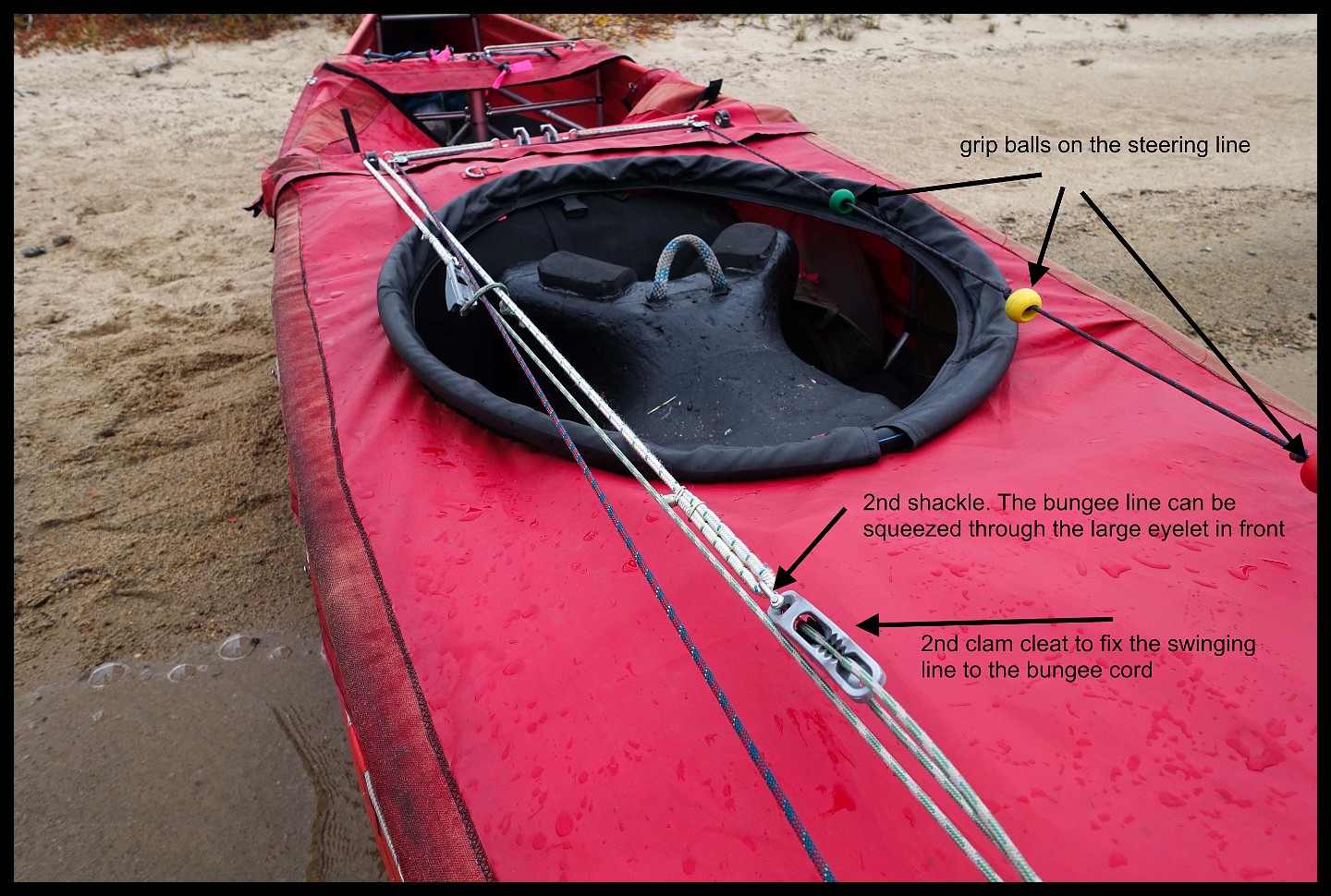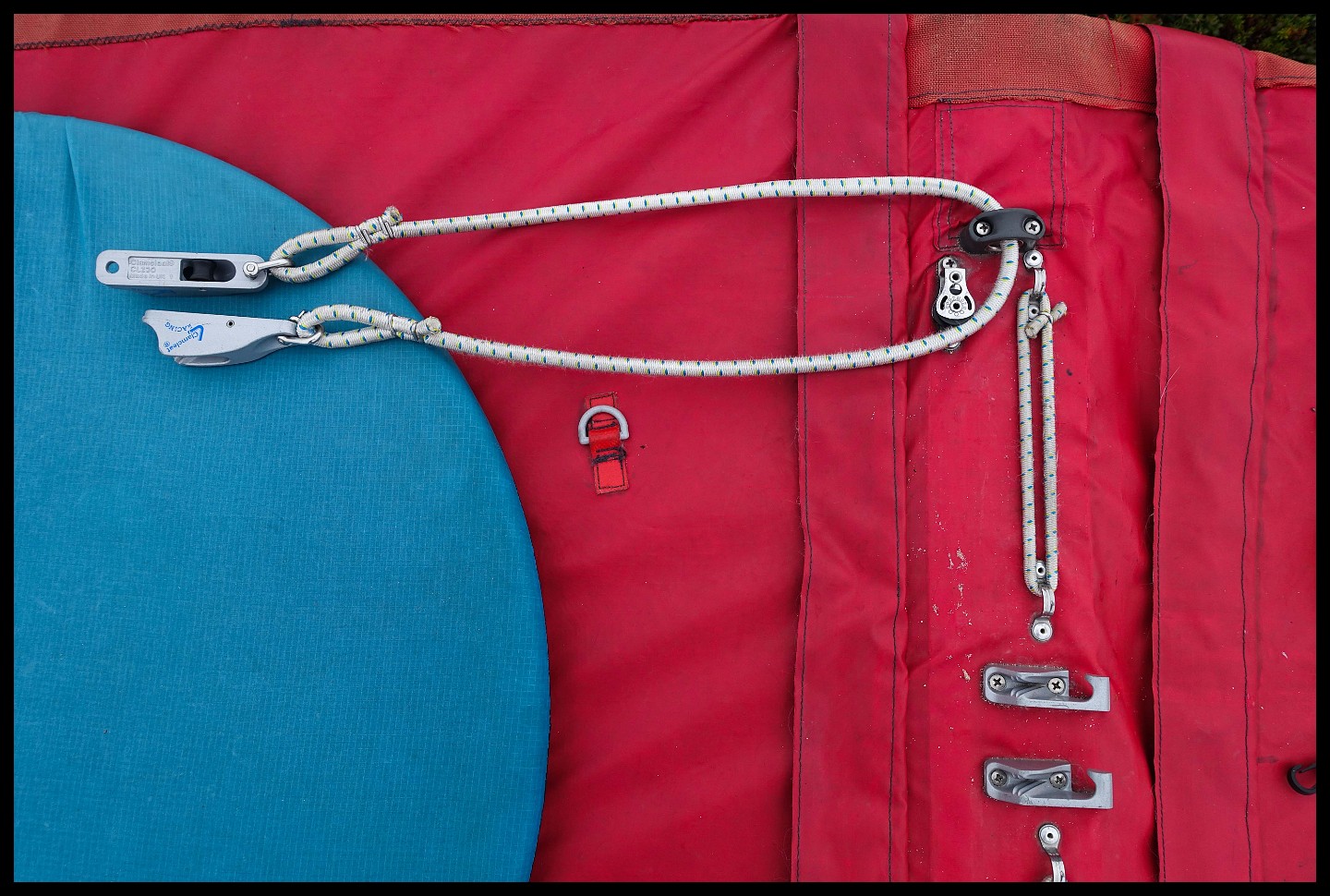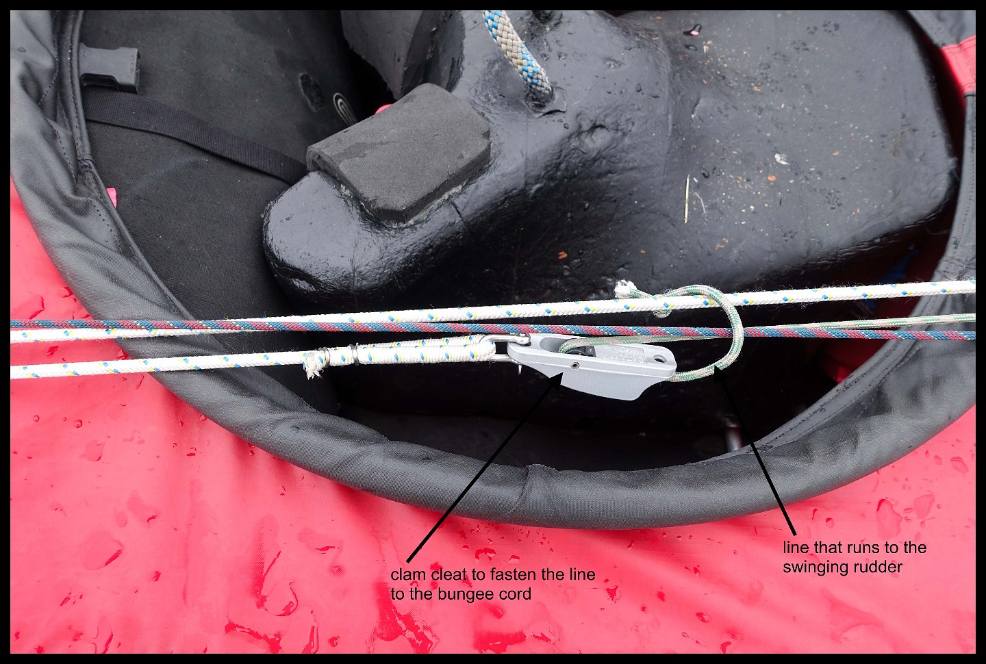 The bungee line (8mm) keeps the rudder fin up. Without it the fin would just fall down by force of gravity. The 2nd clam cleat is not really necessary. You could also tie one end of the white/green line onto the shackle. But to get the line out of the way when undoing the spray cover you need one clam cleat.