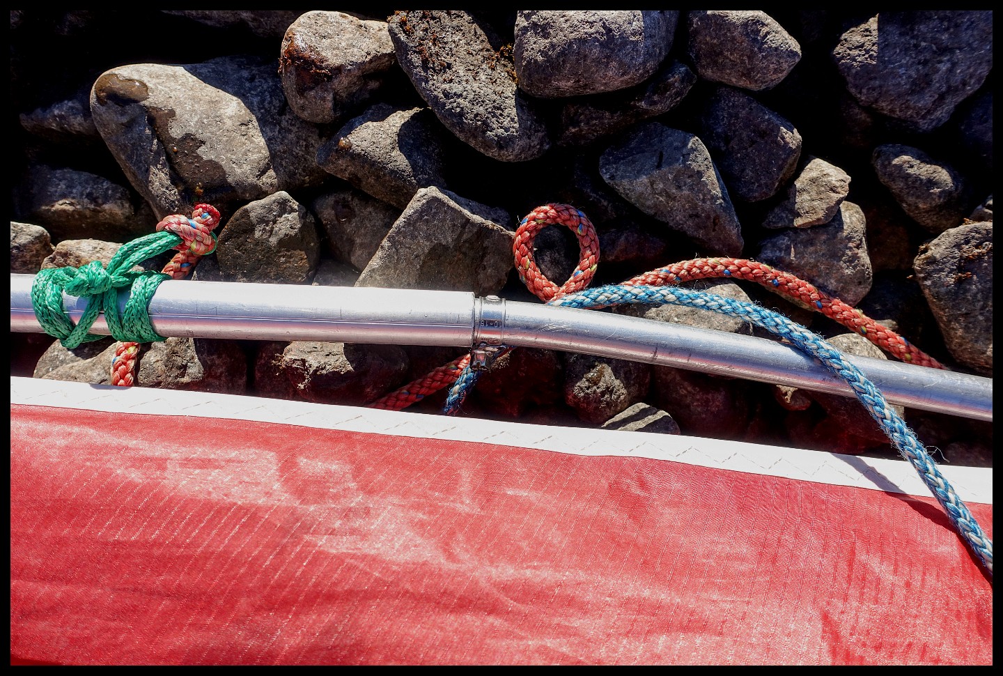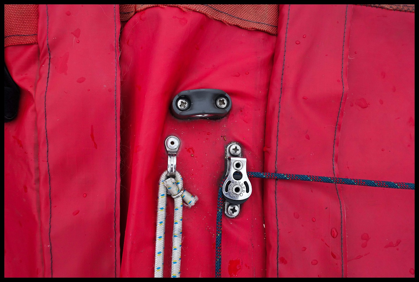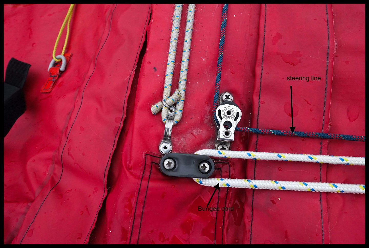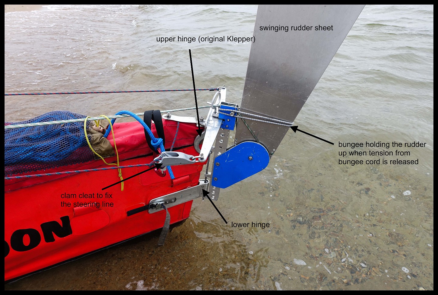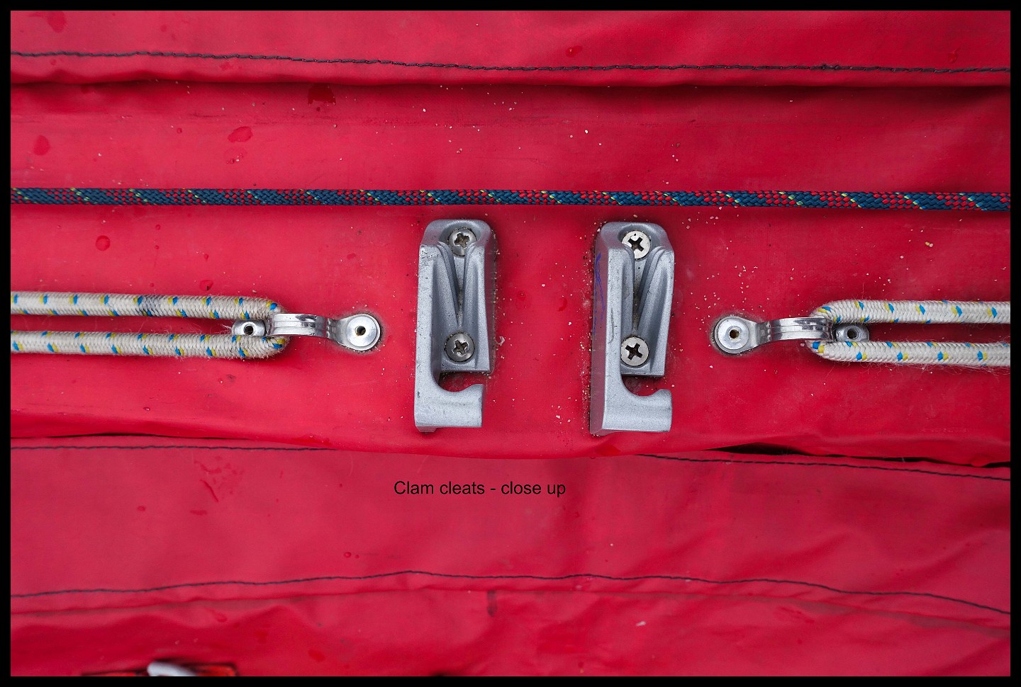 The bungee line (8mm) keeps the rudder fin up. Without it the fin would just fall down by force of gravity. The 2nd clam cleat is not really necessary. You could also tie one end of the white/green line onto the shackle. But to get the line out of the way when undoing the spray cover you need one clam cleat.
