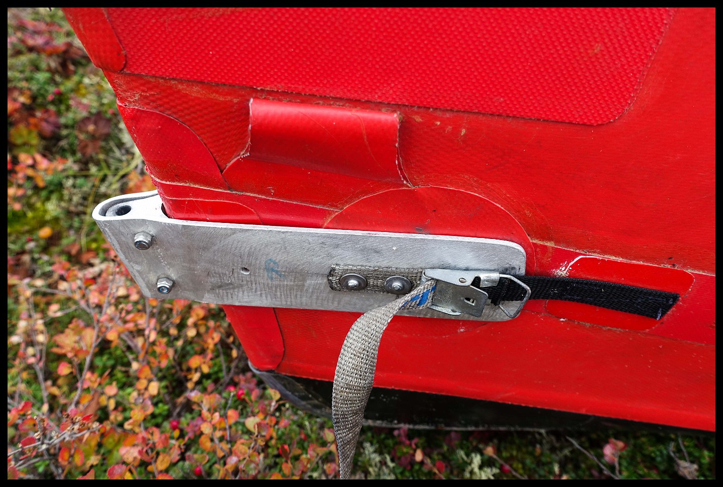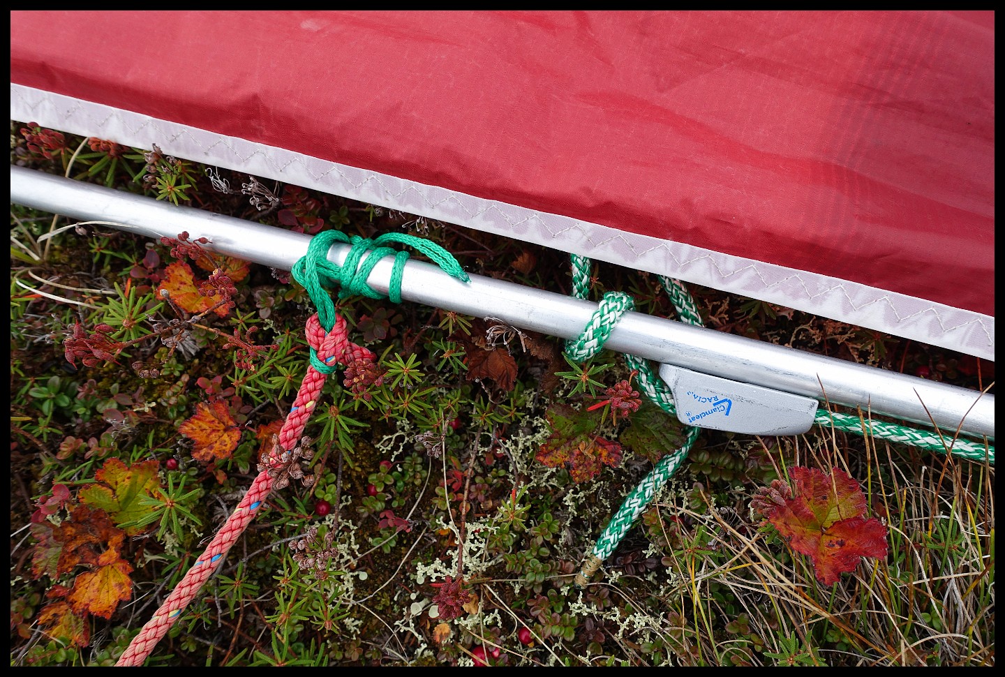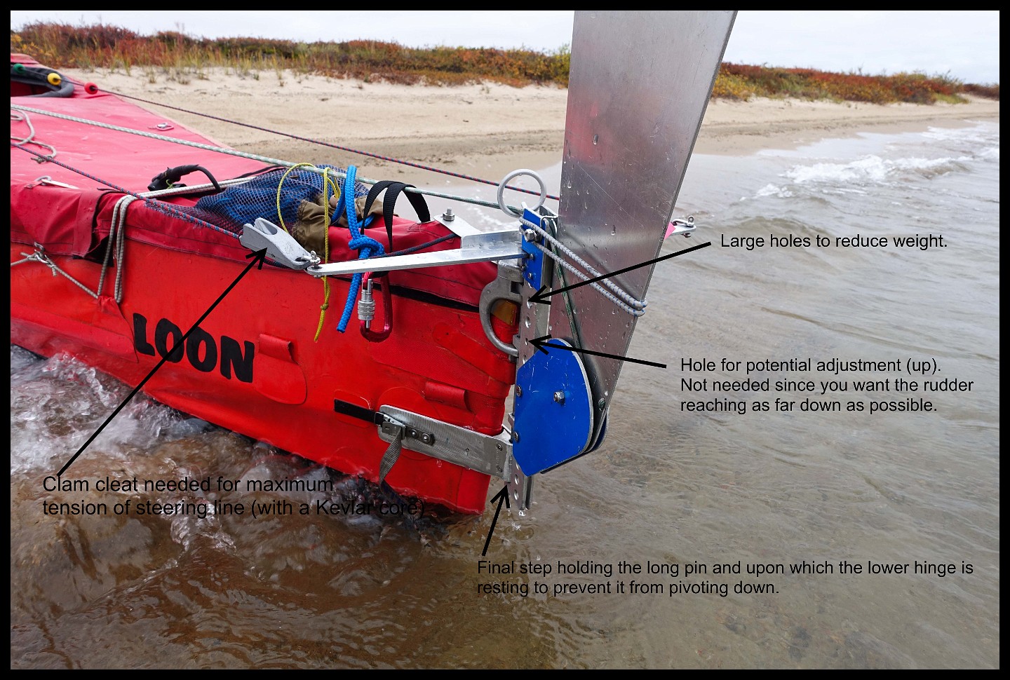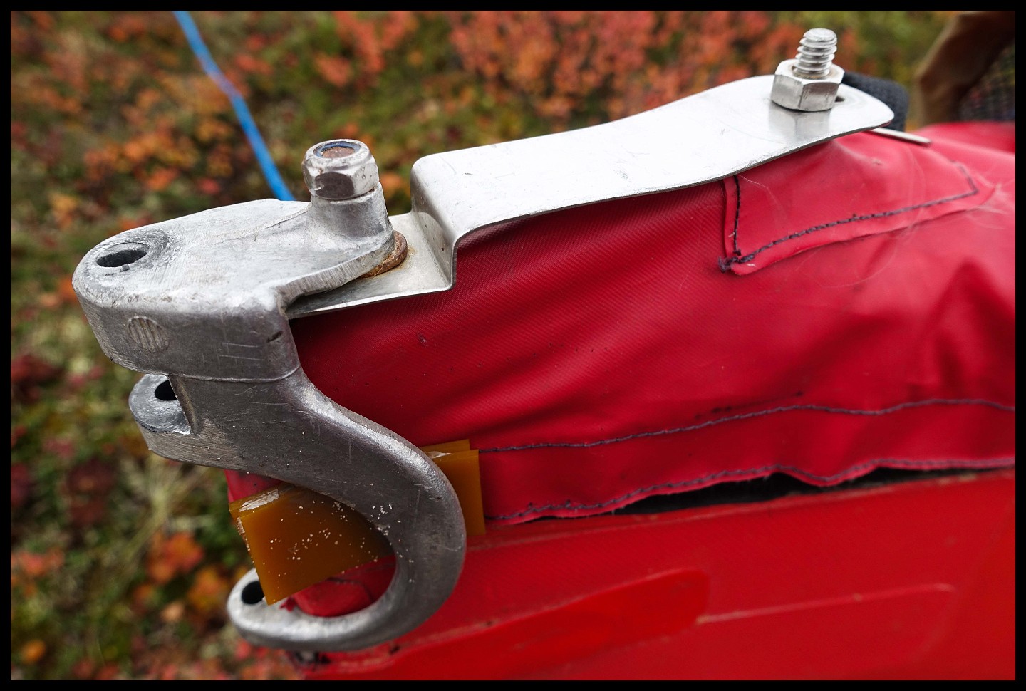 The bungee line (8mm) keeps the rudder fin up. Without it the fin would just fall down by force of gravity. The 2nd clam cleat is not really necessary. You could also tie one end of the white/green line onto the shackle. But to get the line out of the way when undoing the spray cover you need one clam cleat.