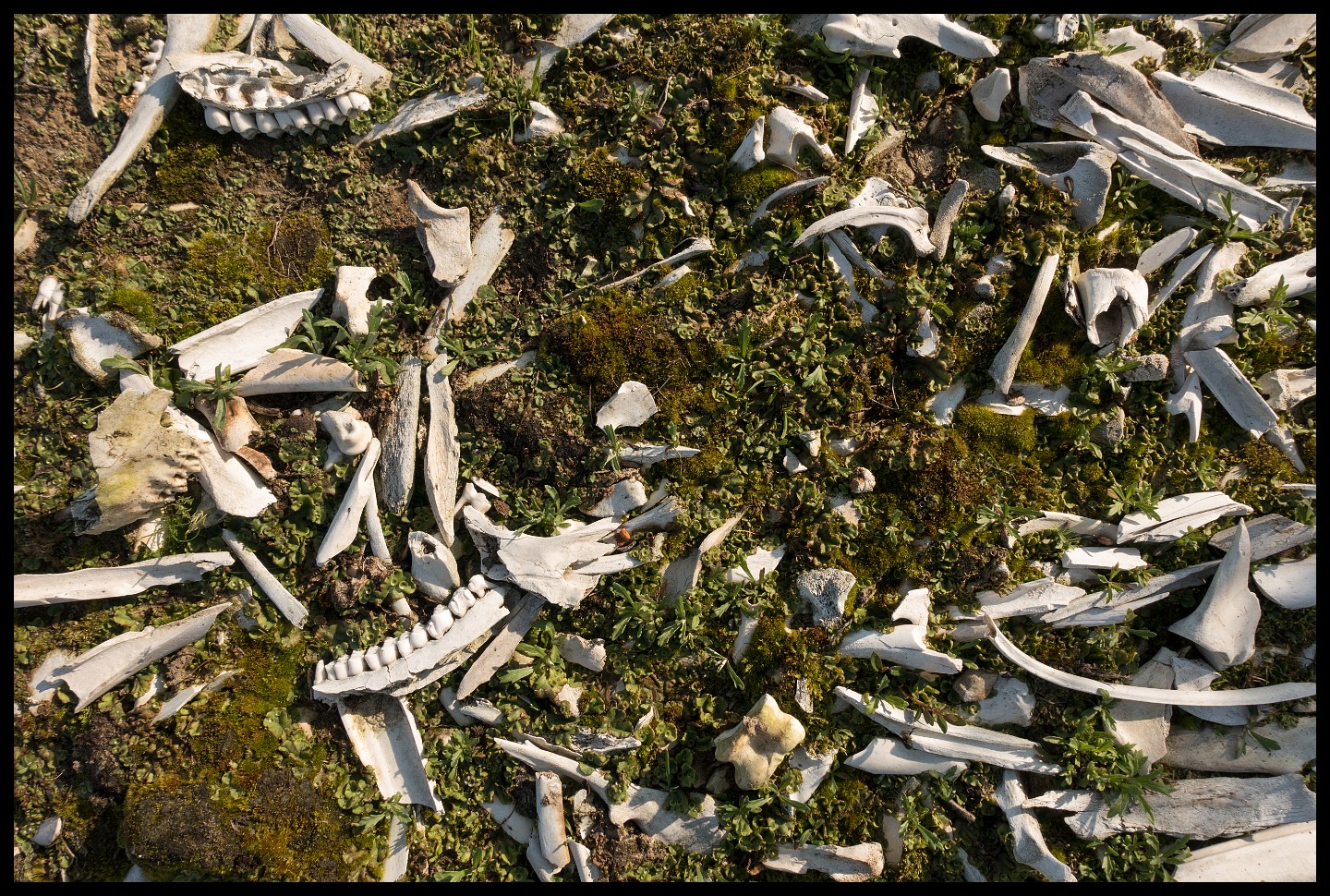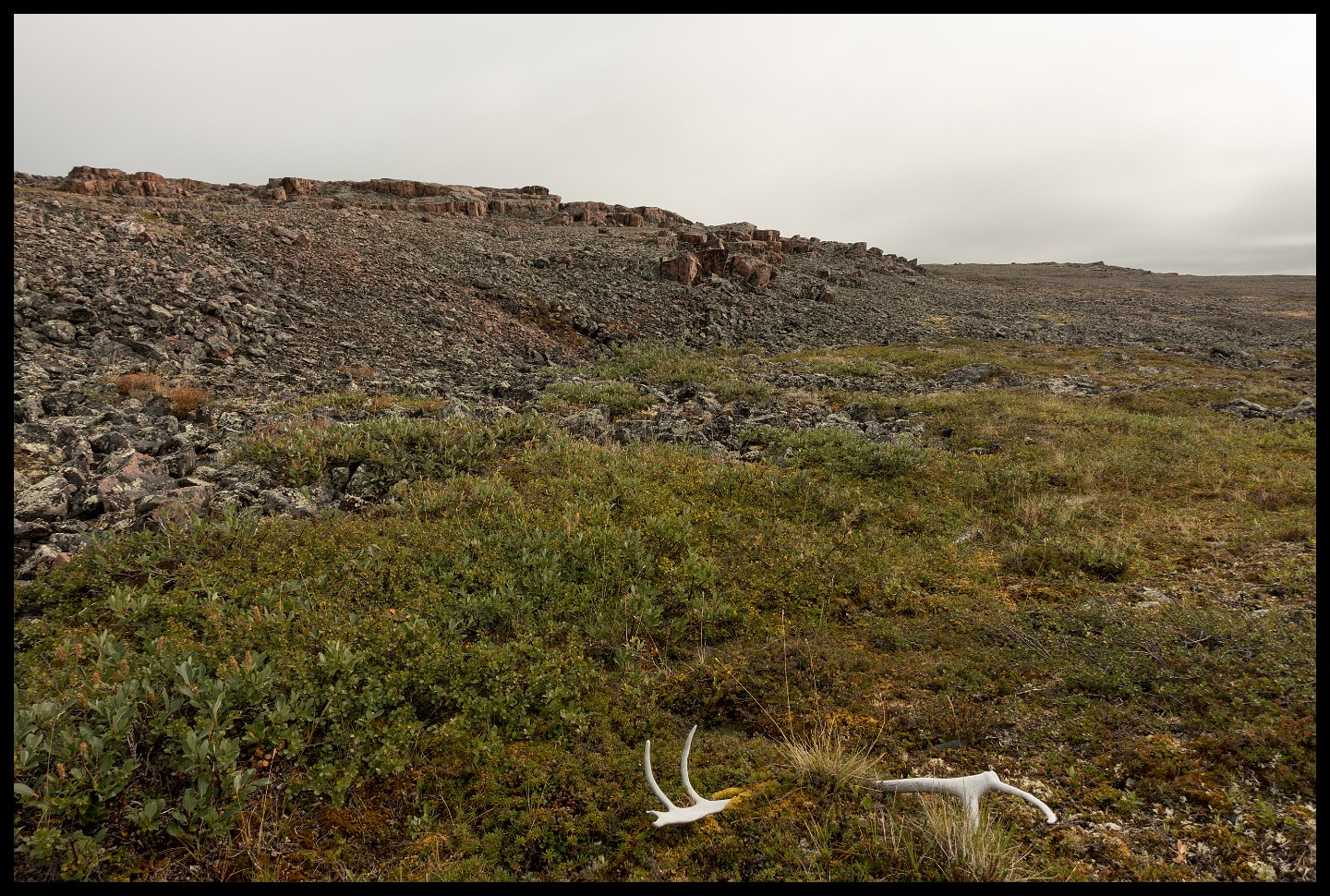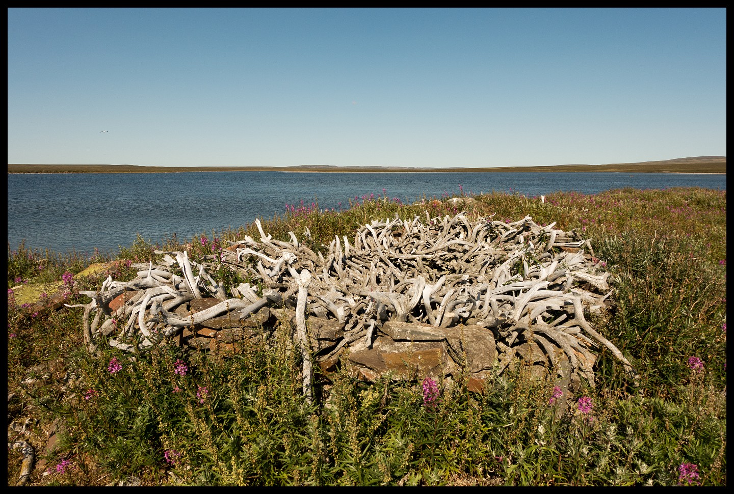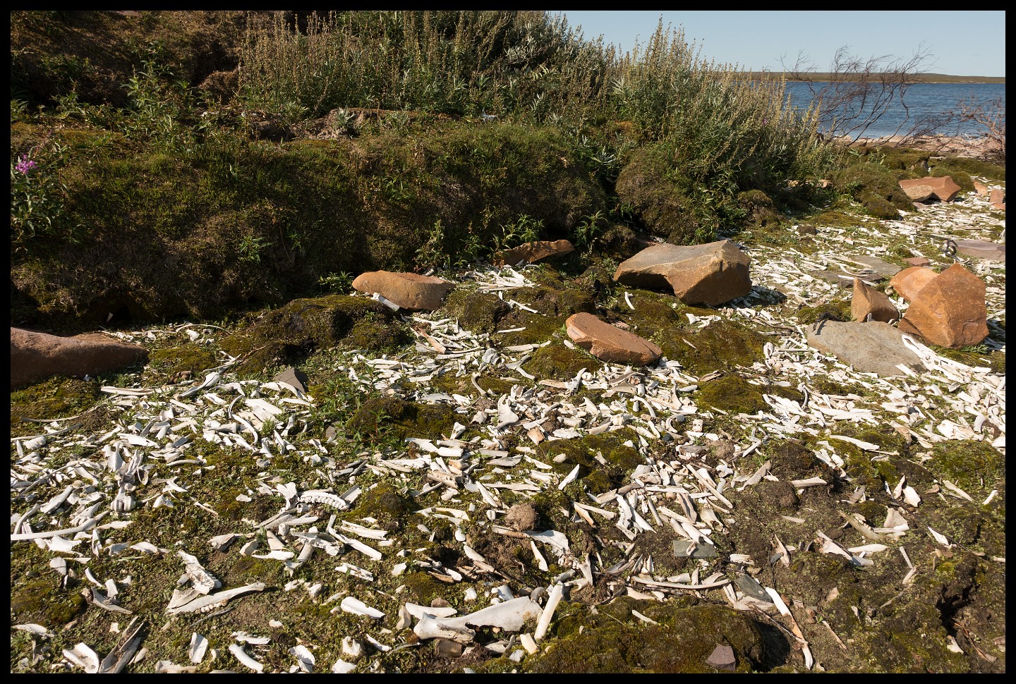Caribou bone and antler blanket the island and pave the shallows around it.