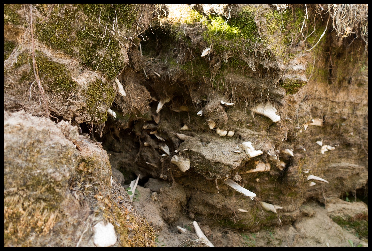 Layer upon layer of bone fragments, carbon-dated to 1450-1750 A.D., a time refered to as the "Little Ice Age".