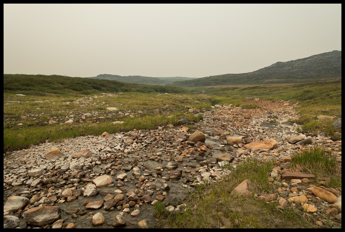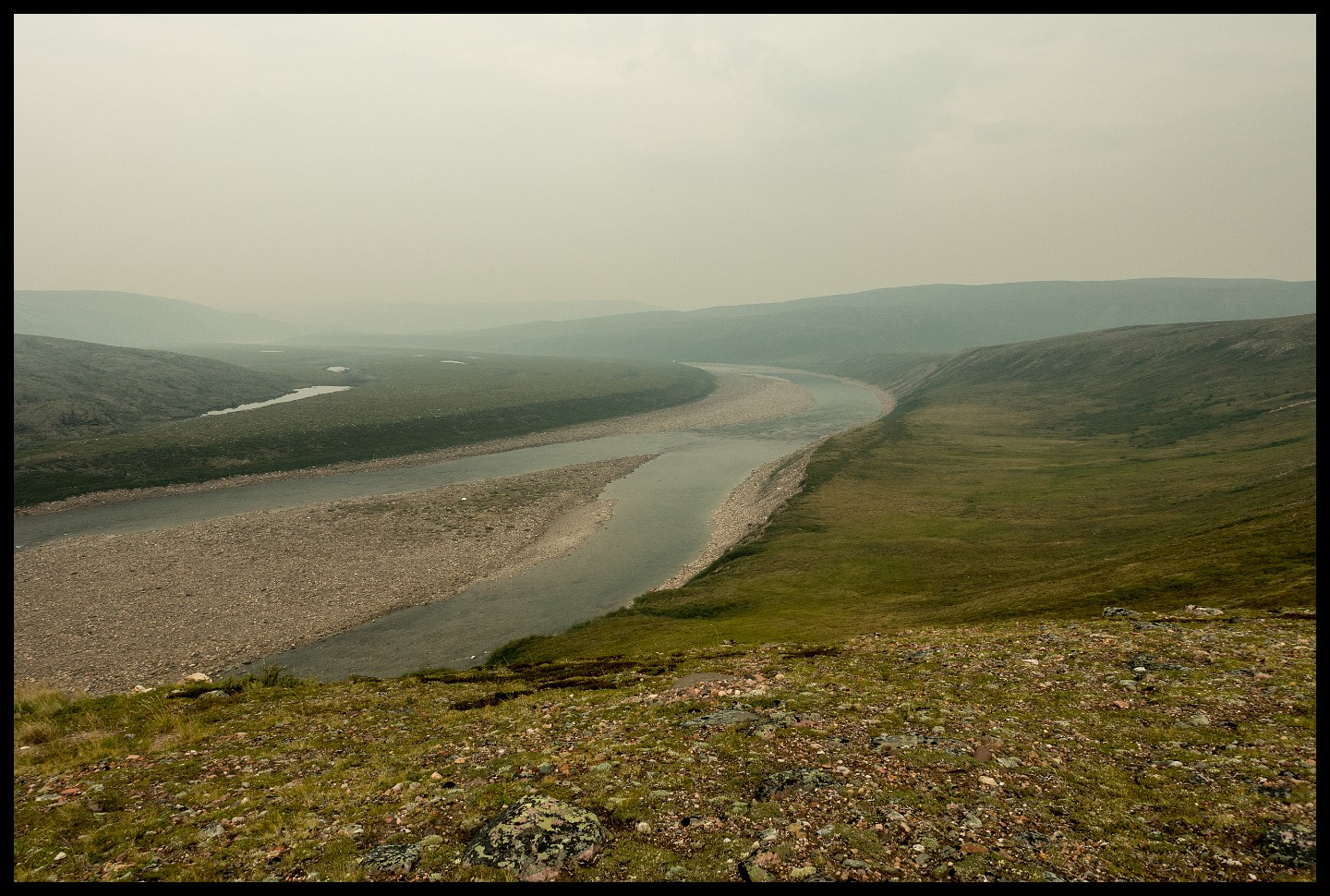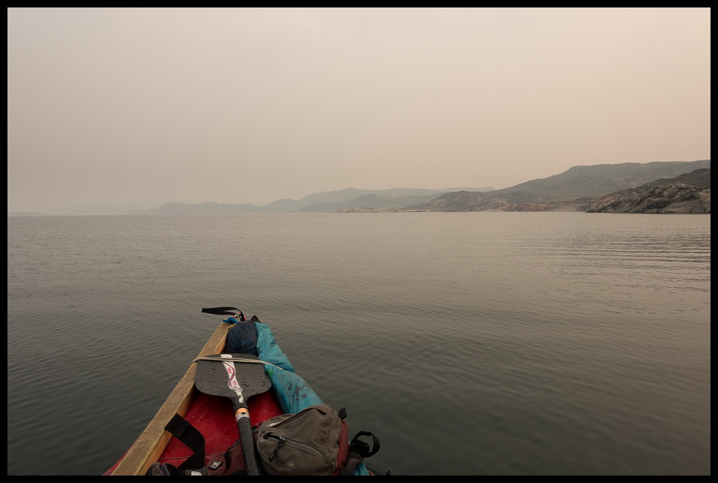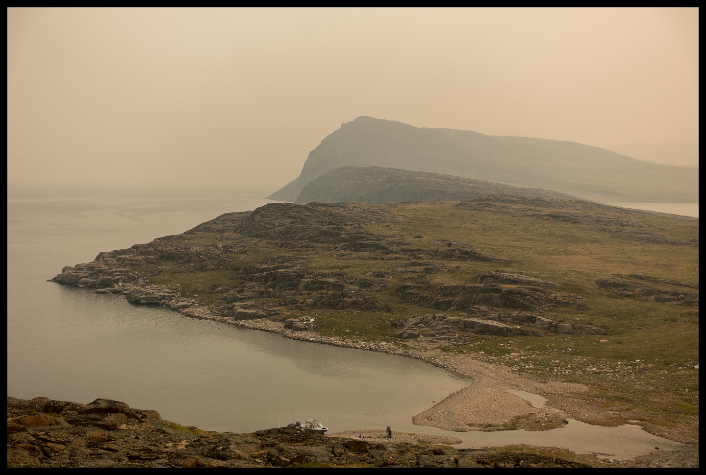 The same spot from on top of the esker, with lots of smoke from the wildfires down south.