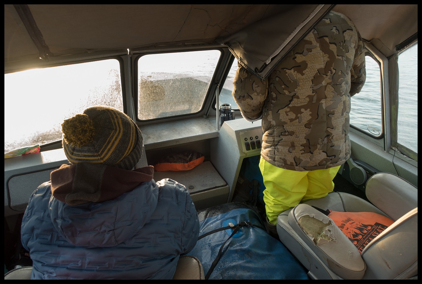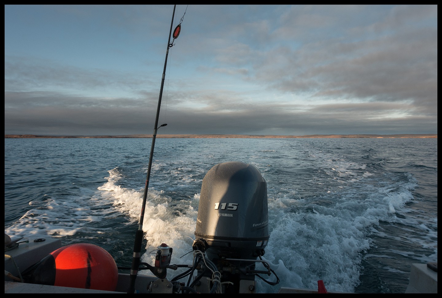 George Angohiatok and his wife Mabel kept a careful lookout for rocks in these shallow waters on our way to Cambridge Bay.